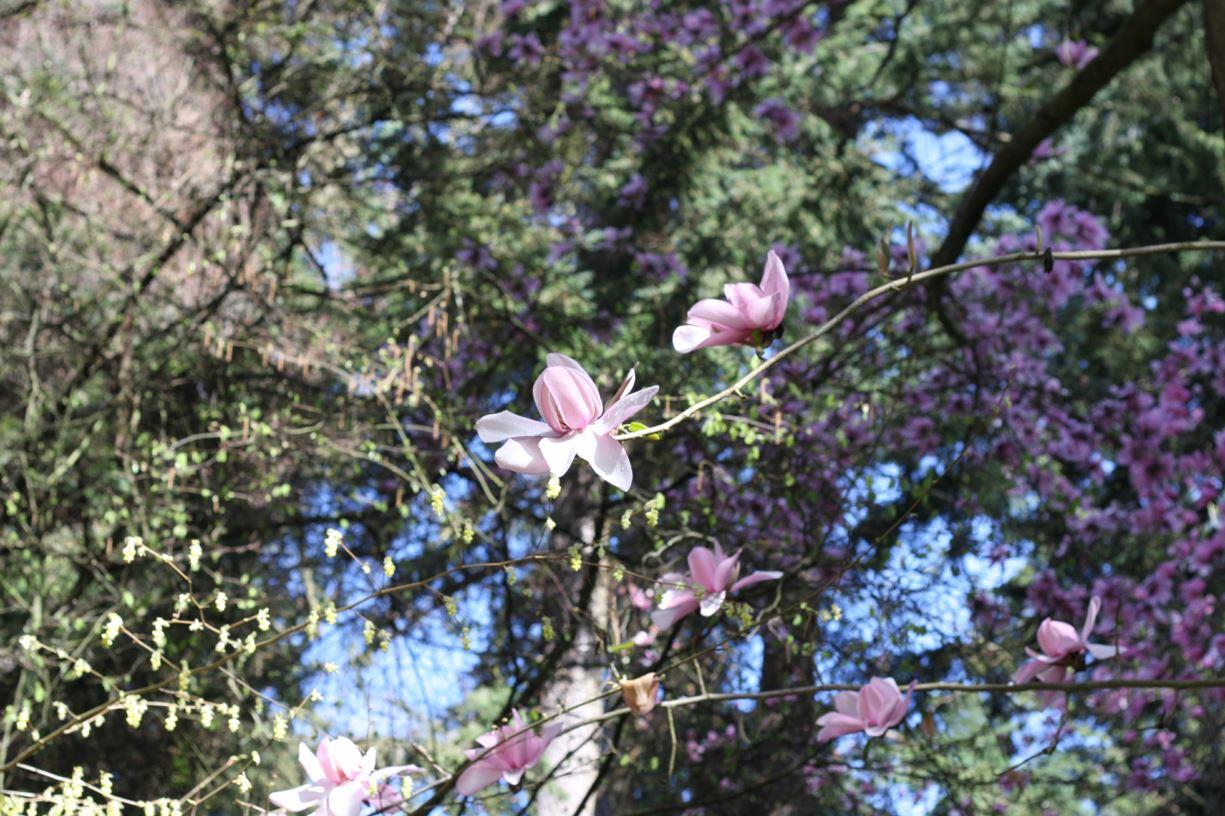 In the David C. Lam Asian Garden, Magnolia zenii, usually our first to open its buds, started in mid-March, and while the specimen of Zen’s magnolia at Maries Trail and the Service Road may have finished, there are two others that start a week or so later (one by Kingdon Ward Way and Upper Asian Way and the other on Lower Asian Way west of Kingdon Ward Way). Next on the blooming calendar is usually M. sargentiana ‘Blood Moon’, visible from Lower Asian Way and Stearn Trail. This often coincides with the ever-popular bi-coloured and bubble-gum-scented M. sprengeri ‘Eric Savill’ (on the boardwalk next to the Ting, and at the west end of the parking lot). A flurry of M. sprengeri and M. sargentiana cultivars, selections and seedlings follows. For example, there is a lovely M. sargentiana next to ‘Eric Savill’ by the Ting. Perhaps the most reliably impressive of Dr. Sprenger’s magnolias in the Garden is the spectacular M. sprengeri var. diva, located where Upper Asian Way and Lower Asian Way diverge. Magnolia cylindrica (at the back of the Reception Centre) slides phenologically into the aforementioned group, as do M. denudata ‘Forrest’s Pink’ (on Kingdon Ward Way at Henry Trail) and M. dawsoniana (on Maries Trail near Farges Trail and on Siebold Trail at Rock Trail). In terms of numbers, M. campbellii is the most common of the Garden’s magnolias, and it is among the most interesting of the Asian species, given its enormous colour range (white, cream, salmon, pink, magenta, etc.), flower size and variation in cold-hardiness (corresponding to its wide distribution from the Himalayas to western China and Indochina). Perhaps the most notable of the Campbell magnolias is the striking magenta-purple-flowered ‘Borde Hill’ located at Lower Asian Way at Campbell Trail. Many of these magnolias are monitored phenologically by a devoted group of FOGs (Friends of the Garden). Tracked specimens can be identified by the large yellow labels that hang with their name tags. Magnolias don’t stop in April, of course. The North American species and the Asian evergreen species continue through the spring and into the summer.