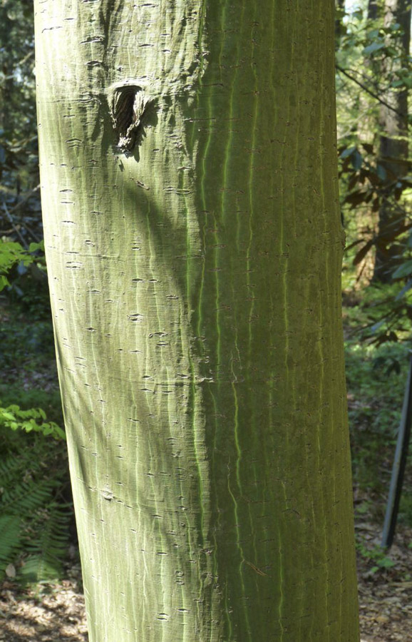 Some trees, like Phellodendron, take their time before producing thick, corky bark, and a number have bark that remains green and actively photosynthetic before doing so. Photosynthesis is the process that uses the sun’s energy to produce chemical energy for plant growth. Any green on a plant indicates living tissues that are capable of photosynthesis. The green pigment chlorophyll mediates the photosynthetic process, which also requires water and carbon dioxide. Roots supply the water, but breathing pores are needed for the CO2 to get into the chlorophyll-bearing cells, and for oxygen and water-vapour, the by-products of photosynthesis, to escape. Pores for gas exchange are typically located on the backs of the leaves, but for the green bark of snake-bark maples, the pores are usually organized in long, vertical lines. And to prevent the water vapour from escaping too quickly, these lines are furnished with waxes. Acer pensylvanicum (moosewood) in particular, stands out for the contrasting, waxy white stripes that line its trunks and branches. Several others in the snake-bark group have attractively striped stems, and a few have bright green, unstriped stems (in these, the pores are more scattered and not congested with waxes). Acer laxiflorum (loose-flowered maple) and Acer forrestii (Forrest’s maple) are perhaps the best examples, though there is an extraordinary, forty-year-old Acer davidii (Pere David’s maple)—a usually striped-bark species—near the west end of Handel-Mazzetti Trail that has smooth, uninterrupted green bark. The danger with green bark is that it is perilously thin and easily damaged—these are living cells below only a fine coating of transparent epidermal wax—and we see that snake-bark maples that are old, sun-exposed or mis-handled will eventually develop a protective layer of corky bark.