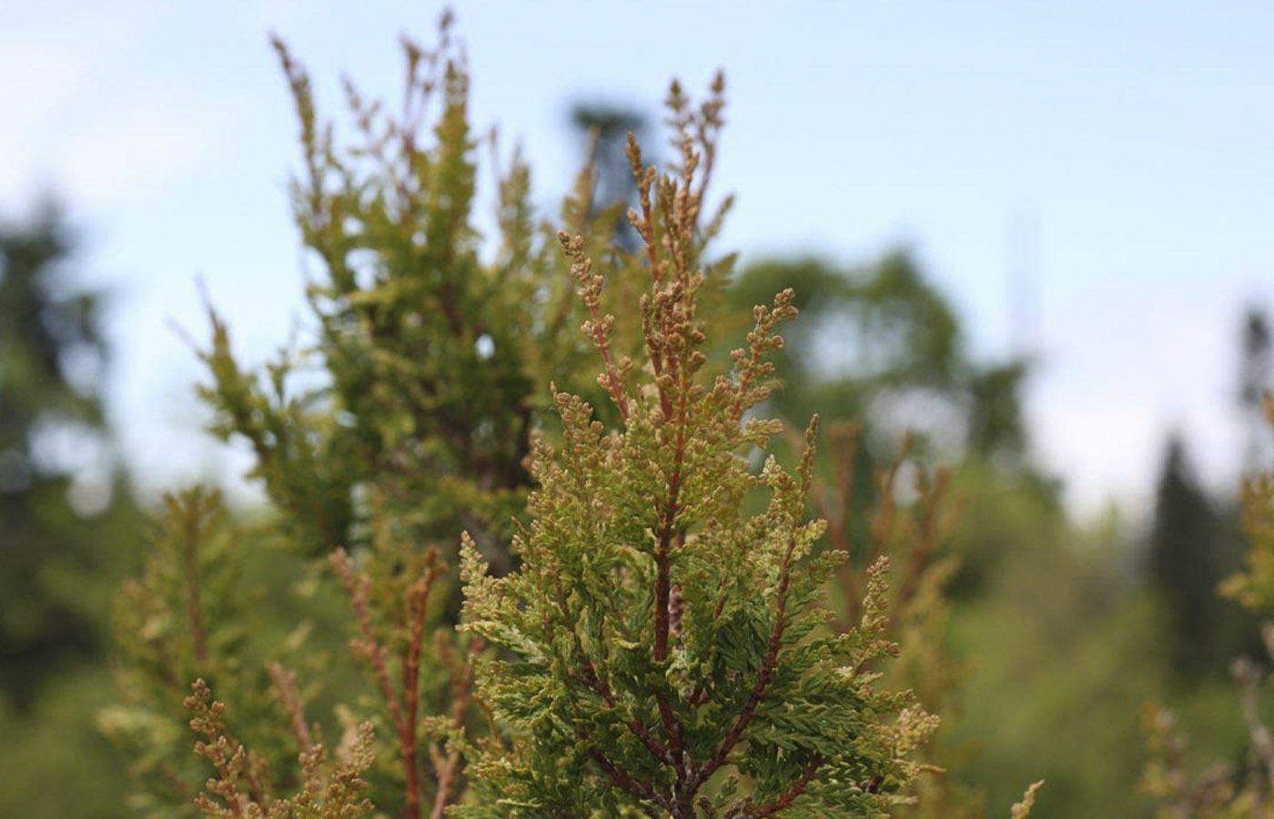 Podocarps (members of Podocarpaceae, the plum yew family) also number three in the South American Section, and these are all native to forests far to the north of the cold Magellanic subpolar region. Saxegothaea conspicua (Prince Albert’s yew) is currently our tallest south American conifer (the monkey puzzles will push past them in a few years). True to its common name, S. conspicua is yew-like in appearance—if somewhat more open branched and upright. Its cones, however, are unlike those of other podocarps (they look like miniature globe artichokes). Podocarpus salignus (willowleaf podocarp) is close by, near the top of the slope. As a recent transplant, this famously (potentially) elegant species suffered quite a bit from the extremes of the past couple of years (the 2021 heat dome, then brutally cold temperatures and winds last winter). In spite of the hardships, the plant appears to be establishing well, with the newest growth looking healthy and strong. In a warmer climate, it is ultimately a tree with a dome-shaped crown that can reach 20 m tall. The yew-like Prumnopitys andina (Chilean plum yew), must surely take the prize as our most robust South American conifer. Like Podocarpus, Prumnopitys is a genus that spans both South America and Australasia; however, the Chilean plum yew is the only Prumnopitys species cold hardy locally. And cold-hardy it is, despite being native to habitats where temperatures rarely fall below freezing. Our plant has survived—indeed thrived— without any visible damage, since it was planted out in 2003.