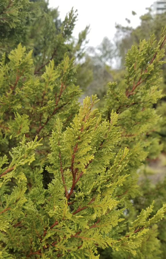 Perhaps the South American conifer with the most familiar-looking foliage is Austrocedrus chilensis (Chilean incense cedar). This tree bears flattened sprays of scale-like leaves in the manner of some false cypress (Chamaecyparis) species, and cones that are nearly identical to those of the Californian incense cedar (Calocedrus decurrens). Despite the name (Austrocedrus means southern cedar), this species has the northernmost range of all the Andean cypress relatives and is thus not quite as cold hardy as the others. The Chilean incense cedar, too, is threatened by logging, but also by imported root diseases. Ours seems healthy enough, but now that it’s reached about 2.5 m in height (probably the height of the cold winds coming over the stadium fence), all of its energy seems to be diverted to adding to its already substantial girth.
