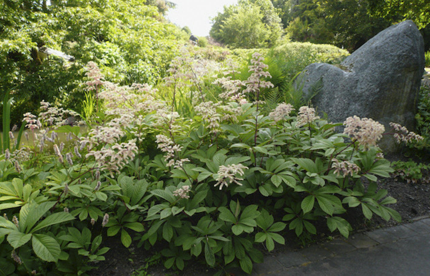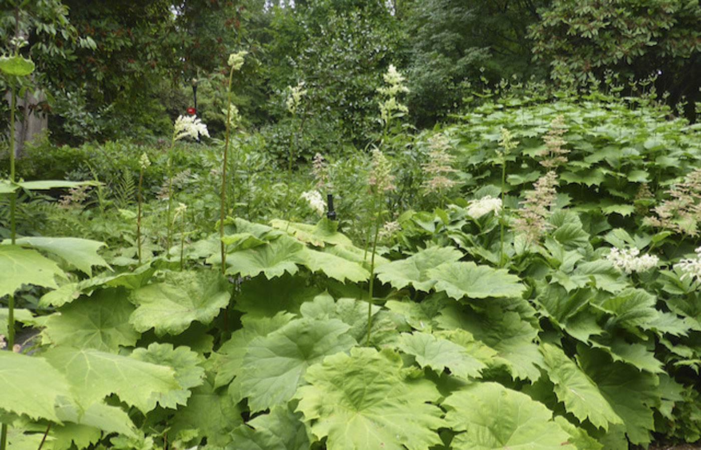 Foremost among the summer-blooming herbs in the Asian Garden are the rodgersias. A genus of five herbaceous perennial species native from the Himalayas to East Asia, Rodgersia species are noted for their bold shade-tolerant foliage and large, showy inflorescences (flower stems) composed of small petalless flowers with persistent, coloured sepals—the sepals and stamens taking over the pollinator-attraction duties, as it were. Like the similar, but mostly smaller astilbes, rodgersias are colony-forming, shade-tolerant, summer bloomers that revel in rich, moist soil. Rodgersias are planted throughout the Asian Garden, and because they provide an exceptionally dense canopy of bold, mostly clean, unblemished foliage, they are both texturally beautiful and ideal for suppressing weeds on a large scale. It’s worth mentioning that the “umbrella-leaf rodgersia” (a.k.a. “shieldleaf”), which often accompanies rodgersias in plantings around the Asian Garden, isn’t a rodgersia at all. Astilboides tabularis was once classified as a rodgersia, and the species inhabits the similarly moist habitats in northeast China and Korea, but the two genera are easily distinguished. Astilboides produces huge, umbrella-like leaves and tall, plume-like inflorescences with five-petaled flowers. Look for it on the west side of Upper Asian Way north of Staunton Trail and especially along Stearn Trail.