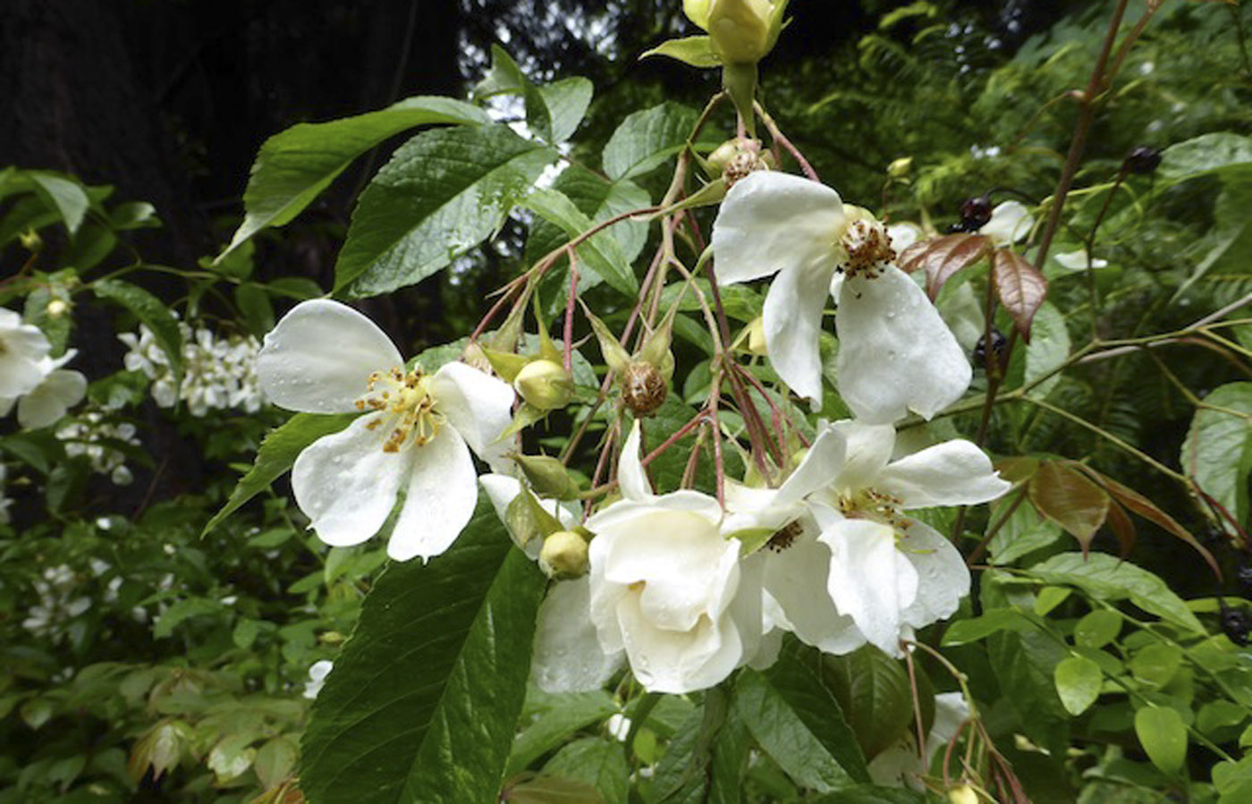 In the David C. Lam Asian Garden, primarily Chinese and Himalayan species clamber over large shrubs and climb up trees. Note, for example, the exquisitely fragrant blooms of Rosa helenae (Upper Asian Way near Fortune Trail), Rosa henryi (on Delavay west of Kingdon Ward Way) and especially, the magnificent Rosa filipes ‘Kiftsgate’ (where Forrest Trail and Rock Trail meet). These climbers are all from China or the Himalayas and nearly all of them have similar hooked prickles on exceptionally long stems that climb, sprawl or recline. They have prickles on their leaves and leaf stalks, and sizeable clusters of usually smallish, but oh, so fragrant white flowers. Botanical descriptions typically state that they grow 6 to 10 m, but here, several species have surpassed 25 m tall after 35 years, ascending mature conifers.