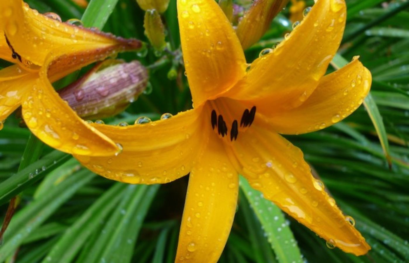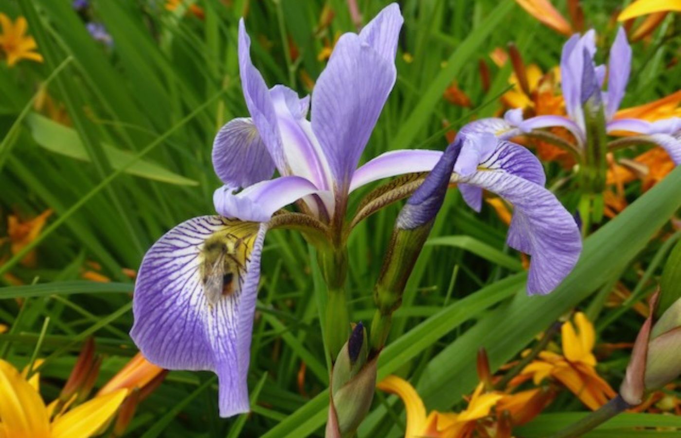 Climbing down from the trees, as it were—did I mention that we have a new tree climbing experience at the Botanical Garden? I’ve done the “Intro” and it’s a blast! —one can see plenty of modest floral beauty in June in our herbaceous collections. Iris x robusta ‘Gerald Darby’ (Entrance Plaza east bed and Amphitheatre Plantings) for example, produces leaves and flowers that might be considered more or less typical of irises, but its stems and stalks are flushed a pleasing purple-black, creating an unpretentious contrast. In the Amphitheatre plantings, ‘Gerald Darby’ is paired with the butterscotch-yellow-and-burnt-orange-flowered daylily, Hemerocallis forrestii ‘Perry’s Variety’. This daylily’s flowers are definitely striking, but never ostentatious. The more demure, pale-lemon-yellow-flowered Hemerocallis minor, a smaller than typical daylily, is suitably located in the Asian section of the E. H. Lohbrunner Alpine Garden, along the path just west of the Alpine Garden sign.