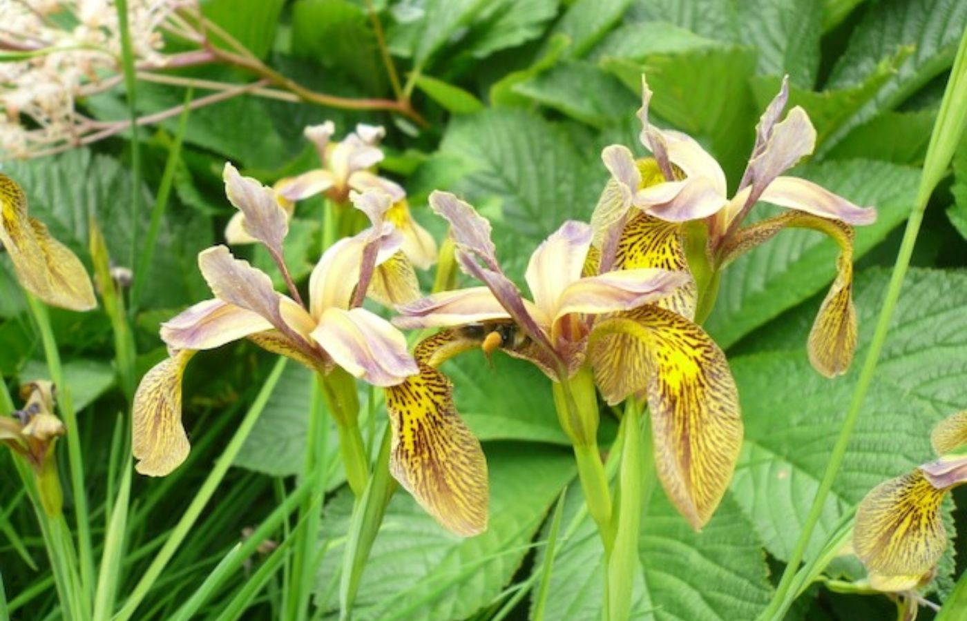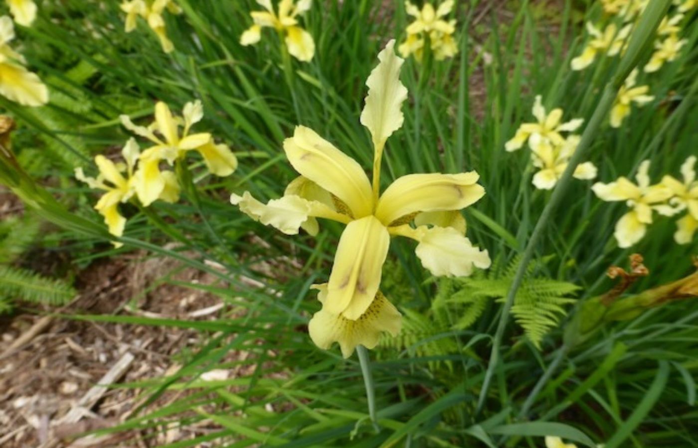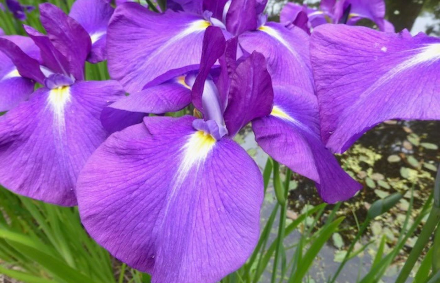 Three other irises are worth a mention for June flowering: Wilson’s iris, Iris wilsonii, Forrest’s iris, Iris forrestii, and the water iris, Iris laevigata. All are in the moist-soil beds along Upper Asian Way either east or west of Straley Trail. Wilson’s iris has lightly marked, pale-butter-yellow flowers atop slender stems, while Forrest’s are taller and yellow, but the falls, standards and style arms are closer to pineapple-yellow and interrupted by more prominent mahogany reticulations. Note that all irises have these petaloid structures (standards, which generally go up; falls, which are frequently broader and descend; and style arms, which are usually narrow and strap-like), and it is primarily the variation in them that allows one to distinguish between the more than 300 species in the genus. The aforementioned yellow irises should not be confused with the indiscreetly-brilliant-yellow flag iris, Iris pseudacorus, a species long banished from the Botanical Garden, not for its garishness, but because it is an invasive species. The selection of Iris laevigata in the Asian Garden is the cultivar ‘Royal Cartwheel’. The blue flowers come perilously close to being excessively showy, but they are definitely less extravagant than the Japanese water iris, Iris ensata, located a few steps away beside the Asian Garden Pond. Avert your eyes.