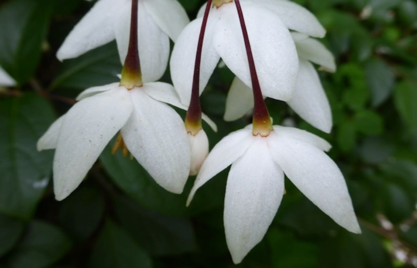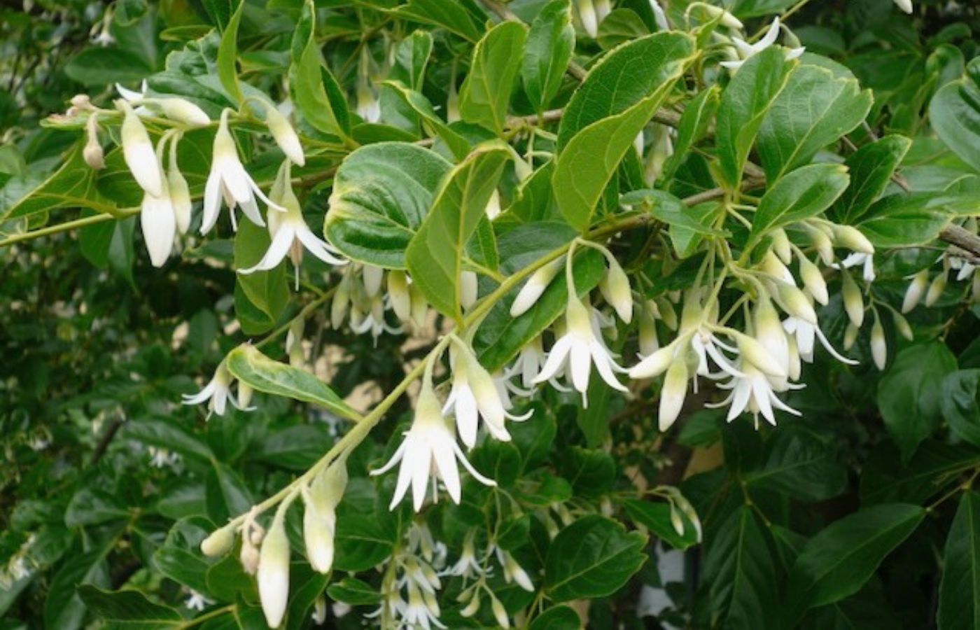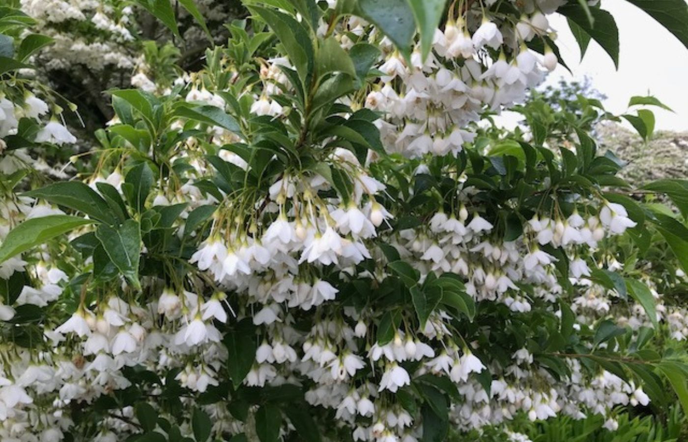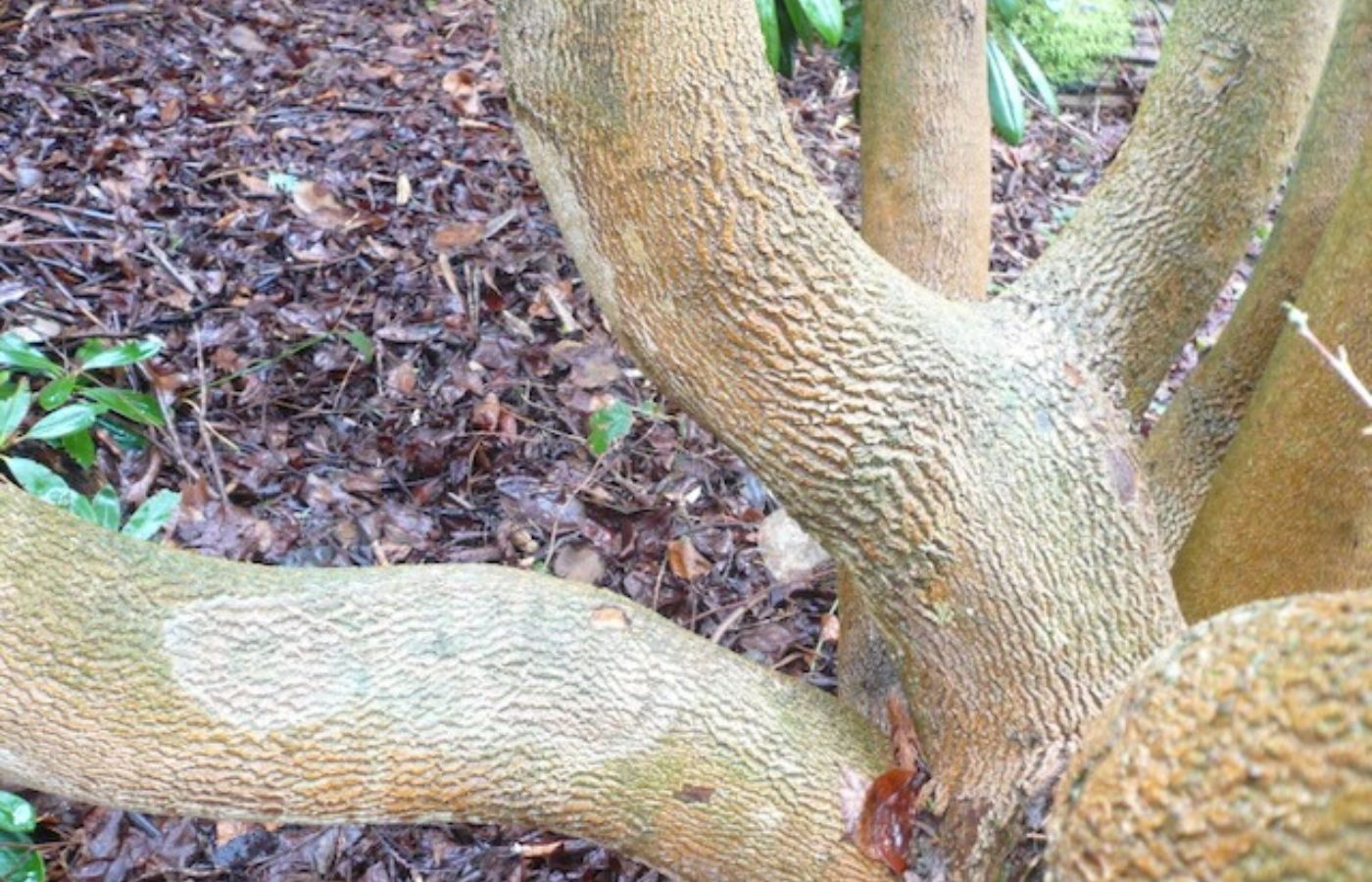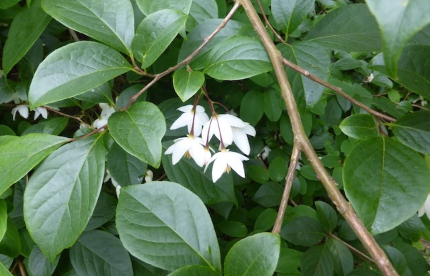 Stewartias are nearly all June flowering. The genus is mostly known by its brazen, peeling-bark species, and much ink has already been spilled on these showy ones. Two subtler stewartias are worth a mention, and these, Stewartia serrata (nodding stewartia) and Stewartia rostrata (beaked stewartia), have flowers, like all stewartias, that are beautiful (not too beautiful, mind). The nodding stewartia (several trees, either side of Delavay Trail south of Upper Asian Way, and where Straley Trail meets Lower Asian Way) produces nodding, creamy white flowers (i.e., they are visible from below the branches), but the finely scaly bark is pale brown, and the overall shape of the tree exceptionally pleasing. Stewartia rostrata (Lower Asian Way below Meyer Glade and Straley Trail west of Siebold Trail) bears larger, whiter flowers that are often stained pink along the petal edges, and has wonderfully textural, pale-grey-brown, finely fissured bark. Either would be considered attractive for their bark alone, were they not overshadowed by their shamelessly exfoliating cousins.