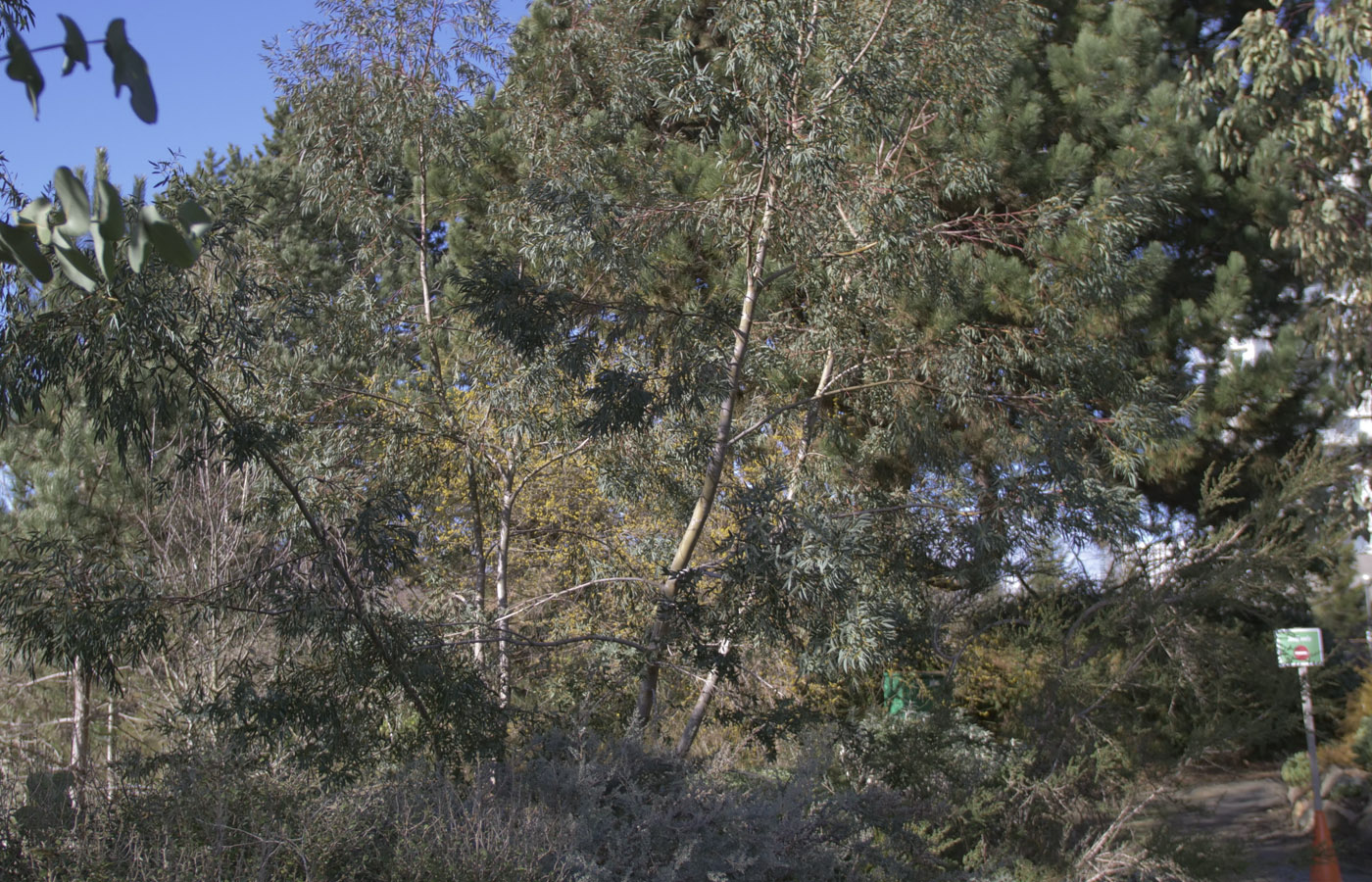 The multi-stemmed Eucalyptus further to the north in the same bed is E. parvula (small-leaved gum). This species is definitely one of the lesser-known eucalypts in Vancouver. It is a mallee (shrubby eucalypt) native to the high country in New South Wales. Eucalyptus parvula is both remarkably cold hardy and capable of tolerating moist soils. Under ideal conditions, it forms a small, broad-crowned tree with semi-pendulous secondary branches and narrow, dark blue-green leaves. When damaged or cut back, the regrowth tends to retain its juvenility for long periods, displaying small, neat, oppositely arranged, red-rimmed, blue-green leaves on arching stems. As the plant matures, leaves develop a spiral arrangement along the stems and become more elongate, to 10 cm in length.