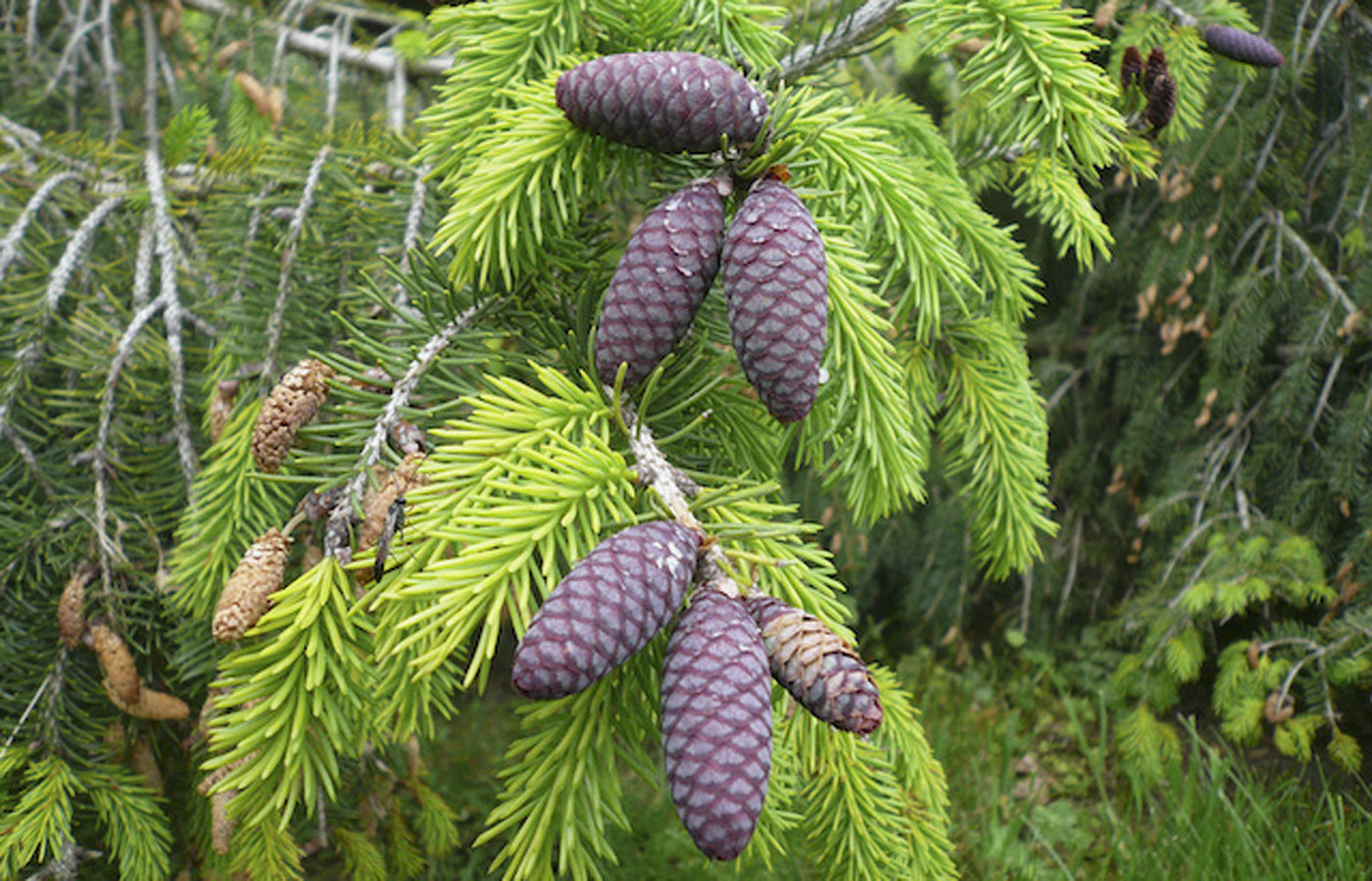 Along North America’s northwestern outer coast, Picea sitchensis (Sitka spruce) provides a formidable barrier to the salt-laden winds off the Pacific. In the shaded, somewhat more benign conditions of the BC Rainforest Garden, the normally skin-piercing needles of this species are somewhat diminished, but I can guarantee that a firm handshake will still leave an impression. Besides mostly sharp-pointed needles, scaly bark and a fondness for cool, moist conditions, Picea species are recognized by their drooping, often narrow, ovoid cones and the persistent woody pegs on which the needles are borne (the pegs are more obvious after the needles have been shed). The Rainforest Garden also houses the exclusively-boreal black spruce, Picea mariana, and another strictly northern species, the strong-smelling Picea glauca (white spruce). While strictly not rainforest species, these latter two species were planted in the 1970s when the Rainforest Garden was known as the BC Native Garden. Rounding out the western spruces is a specimen of Picea breweriana (Brewer’s spruce) located below the Trough Courtyard. Brewer’s spruce is unusual (for a spruce) in having long, flattened, blunted needles, strictly pendulous outer branches and a cast-iron constitution—it is not plagued by any of the usual spruce pests. A highly attractive and rare species found only in the Siskiyou Mountains of northern California and southern Oregon, this specimen produces cones, but because there is no separate pollen source, the cones have never held viable seed.