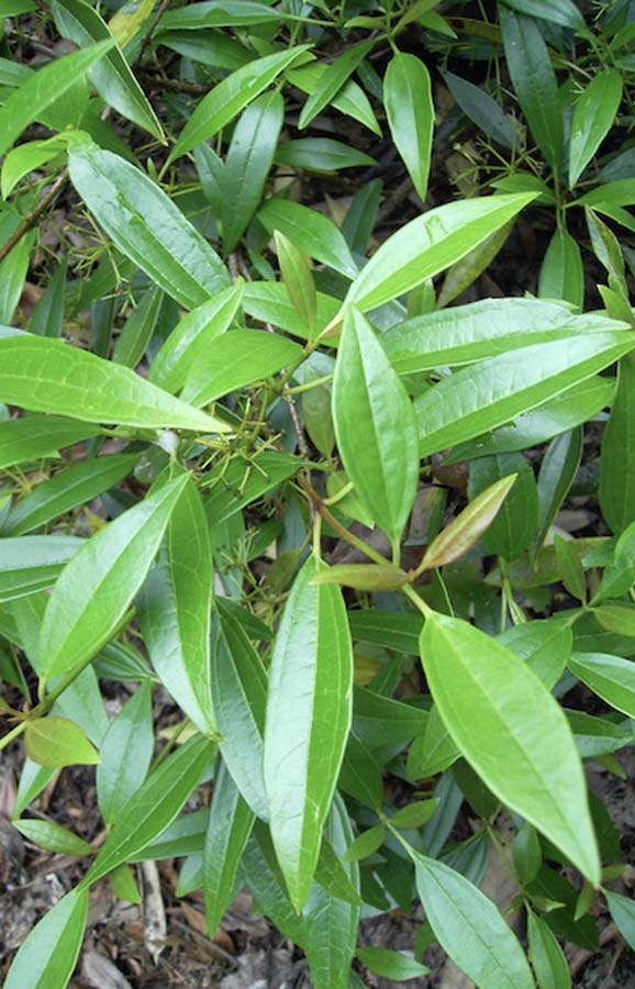Viburnum is a large genus, with over 150 species of deciduous and evergreen shrubs and trees, the majority originating in China. Many are grown for their fragrant flowers, but the evergreens are grown primarily for their beautiful foliage and berries. The largest evergreen viburnum in the garden is Viburnum rhytidophyllum, the leatherleaf viburnum, a species known for its vigorous upright growth and drooping, dark green, crinkly leaves to nearly 30 cm long. This viburnum is often more attractive at some distance, as at close range, it easily overwhelms the viewer with its crowded, multiple stems (to six or seven meters tall) and coarse texture. Early in the year, masses of tiny, creamy white flowers are borne in terminal, flat-topped clusters. These may be followed by red berries, which soon turn black. Leatherleaf viburnum looks attractive with other large evergreens, such as big-leaf rhododendrons, and can be seen in this complementary association in numerous places along the western edge of the David C. Lam Asian Garden.