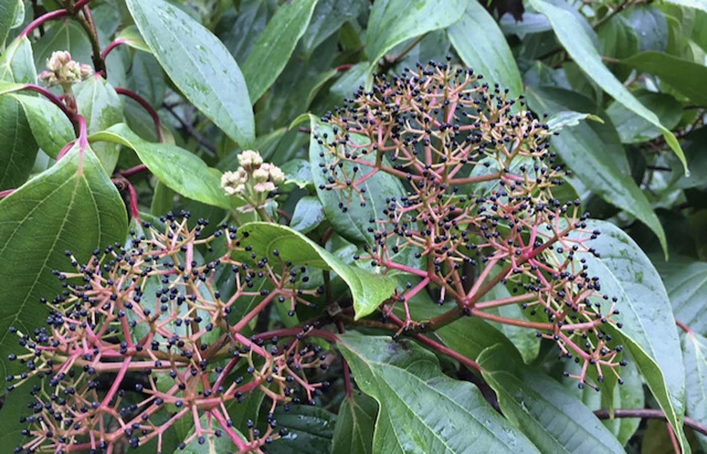 Near the Moon Gate are examples of the curiously-named Viburnum propinquum (propinquus is Latin for “close to”—but close to what?), a widespread evergreen Asian species with attractively pointed leaves, layered branching and compact, flattened clusters of flowers that are followed by small black fruits. Unfortunately, our first-established plants were routinely targeted by the viburnum beetle, a particularly destructive pest that mostly attacks deciduous viburnums. Thankfully, more recent planting does not seem bothered. A closely related species, Viburnum atrocyaneum (Flanagan Trail near Kingdon Ward Way) produces more rounded leaves and rounded clusters of small white flowers, and that, at least in its native habitat (the mountains of northern Myanmar), produces dark, pewter-blue fruits. Also on Kingdon Ward Way, Viburnum chingii, a large, wide-spreading shrub from southwestern China and Myanmar, has small red-edged green leaves. It reliably produces small, red-turning black fruits after its deliciously fragrant, early-summer-borne flowers. One of the most unusual evergreen viburnums in the Garden is the gangly, but oddly handsome Viburnum henryi (Henry viburnum)—an uncommon species noted for its divaricating (wide-spreading) branches, narrow leaves and red-turning-black, lozenge-shaped fruits. Especially in warmer climates the species eventually takes on an arborescent habit, but in ours, Henry viburnum is stubbornly sprawling. There is a large specimen at Upper Asian Way and Kingdon Ward Way and another nearby on Henry Trail just east of Kingdon Ward Way.