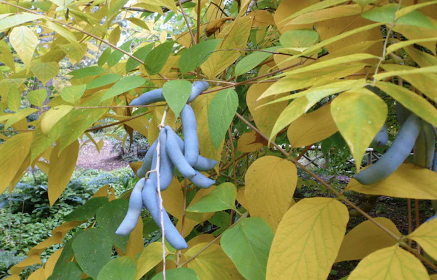 Finally, there are many more autumn fruiting plants that aren’t apple relatives worth seeking out in the Botanical Garden this month. Don’t miss the spectacular orange-berried Celastrus scandens (American bittersweet vine) on the fence at the west end of the Carolinian Forest Garden, the nubbly-orange berries on Arbutus menziesii (Pacific madrone) opposite the Food Garden, and the fleshy, metallic blue pods on Decaisnea insignis (dead-man’s fingers) in various locations in the Asian Garden.