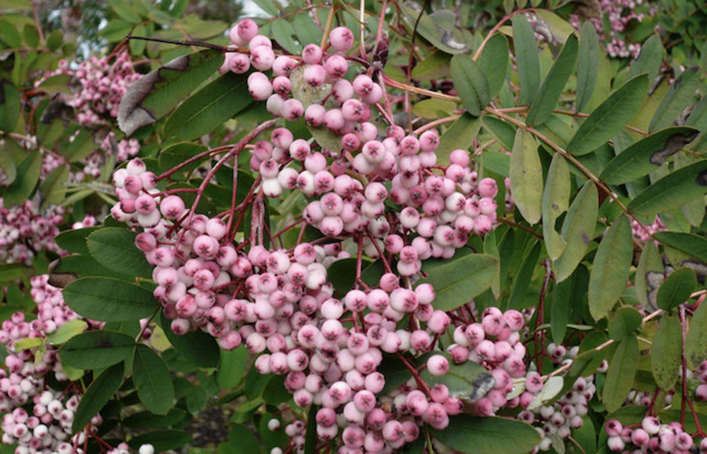 As I’ve indicated numerous times in this blog, October is often the best month to see berries and other colourful fruits in the Botanical Garden. The mountain ashes and whitebeams, formerly all Sorbus species (but now considered, for the most part, Sorbus and Aria, respectively), are front and centre in showing off their beautiful berries. Technically, these are not berries at all, but pomes—like apples and pears—the most obvious difference between a pome and a true berry being the inner “core” that surrounds the seeds in a pome. In the past I’ve highlighted some of the more colourful Sorbus and their close relatives, including Scandosorbus and Hedlundia, for example. This time, I want to focus on the less colourful, but no-less-interesting Sorbus relatives. That said, I should point out that the pink-fruited Hubei mountain ash, Sorbus pseudohupehensis (just west of the Roseline Sturdy Amphitheatre), is putting on a not-to-be-missed performance this year.