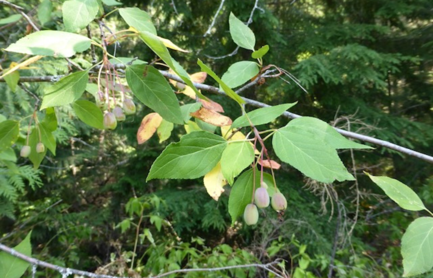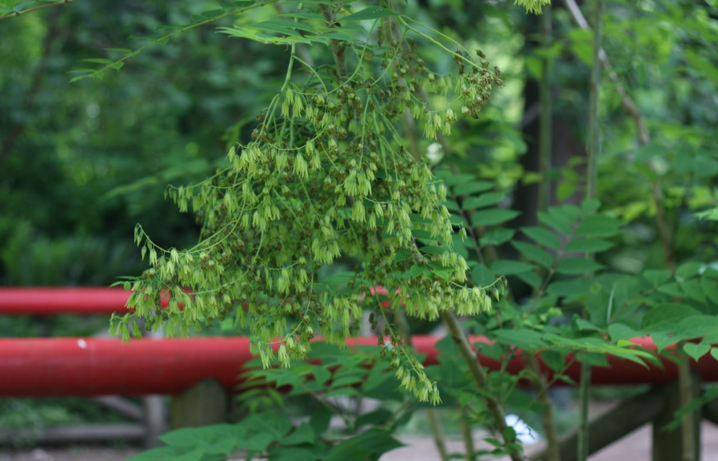 Finally, a perennial favourite among our younger visitors is Decaisnea insignis, popularly known as “dead man’s fingers.” This is a Chinese botanical oddity known for its elegant slender stems topped with a lush crown of tropical-looking, pinnate leaves. Admittedly more large shrubs than trees, there are fine stands of these along Lower Asian Way opposite Decaisne Trail and by the upper bridge in Meyer Glade. Over the summer, bunches of fat, finger-sized, squishy, pod-like fruits (technically, fleshy follicles) develop amongst the leaves at the tips of the branches. The fruits gradually turn an unexpected shade of pale metallic blue, becoming crooked and distended when ripe (hence the common name). They eventually split open to expose watermelon-like seeds embedded in an edible, gooey pulp. Perfect for impressing Halloween visitors. Boo!