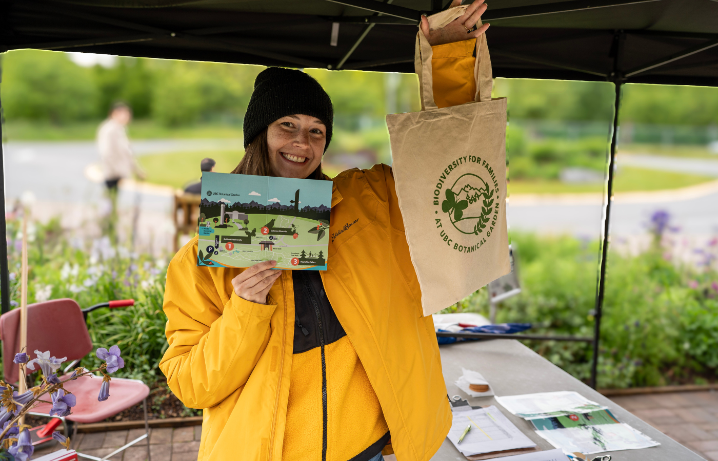 - Rhiannon Lewis from the Sustainability and Community Programs Team holds up a map and tote bag from our Kids Nature Kits at the Family Nature Walk Registration Station. Photo credit: Dane Kapler