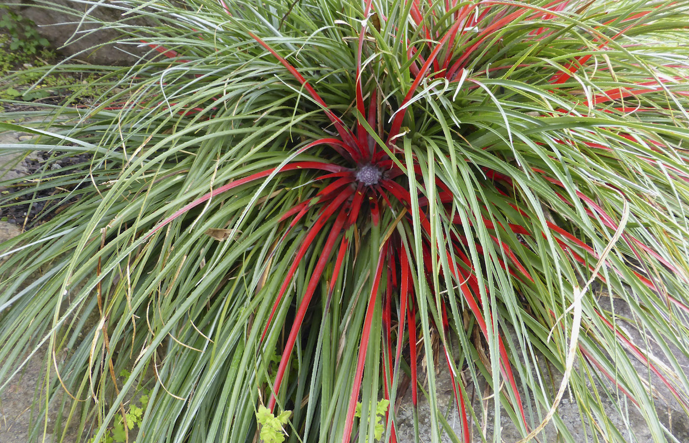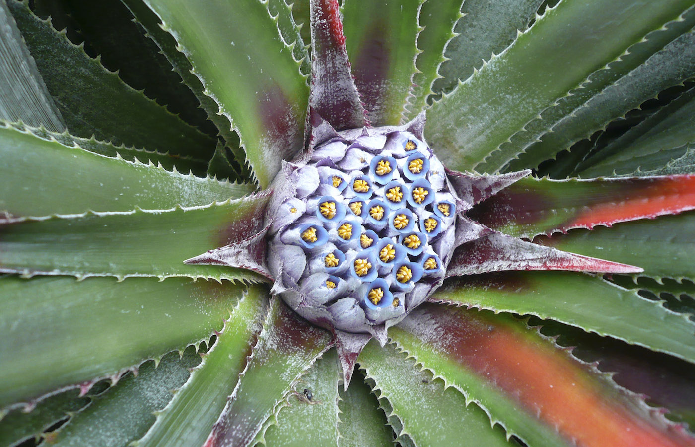 In the South American section, get ready for the cold-hardy pineapple relative, Fascicularia bicolor (crimson bromeliad), a Chilean native that not only has blue flowers, but leaves surrounding them that turn red, presumably to attract hummingbirds, when the flowers are ready to be pollinated.