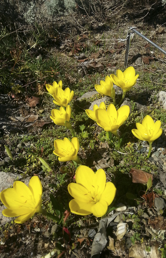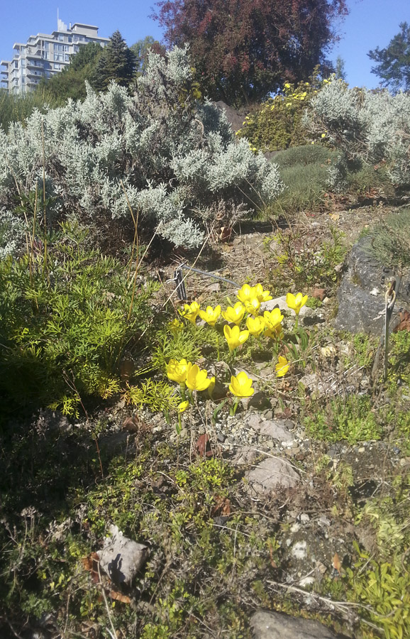 The beautiful lemon-yellow goblets of Sternbergia lutea (yellow autumn crocus) emerge from deep, underground bulbs in September, looking for all the world like, well, yellow crocuses. They are not crocuses at all (nor autumn crocuses—that would be the genus Colchicum), but members of the amaryllis family, closely related to Narcissus (daffodils). The species is native from southern Europe to Asia Minor. Reflecting this, there are small patches of S. lutea in both the Europe and Asia sections.